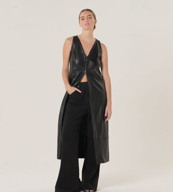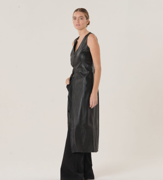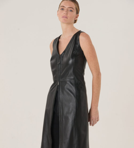 Vestido minimal confeccionado en cuero de oveja soft, con cierre doble apertura frontal y escote V.