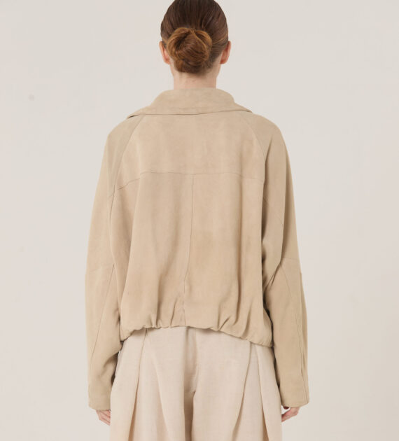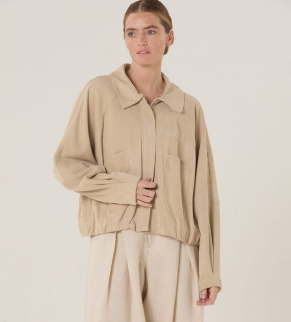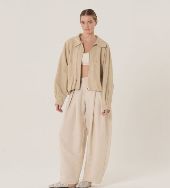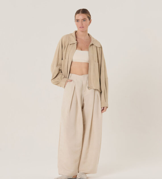 Con un cuello pronunciado, bolsillos ojal en el frente y elástico en la cintura, ésta prenda es perfecta para un look de silueta relajada y delicada a la vez.