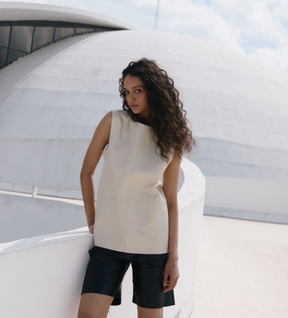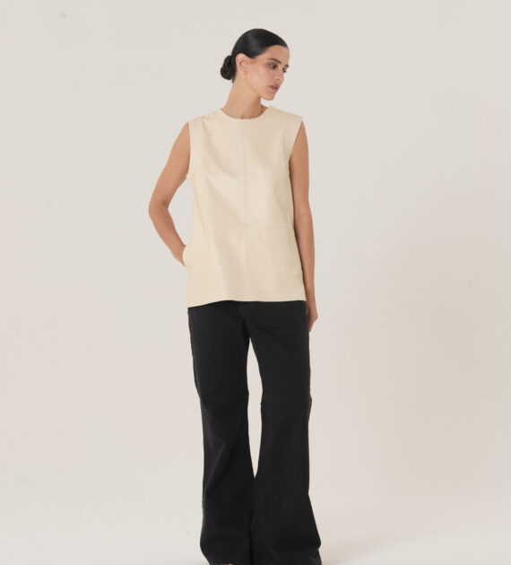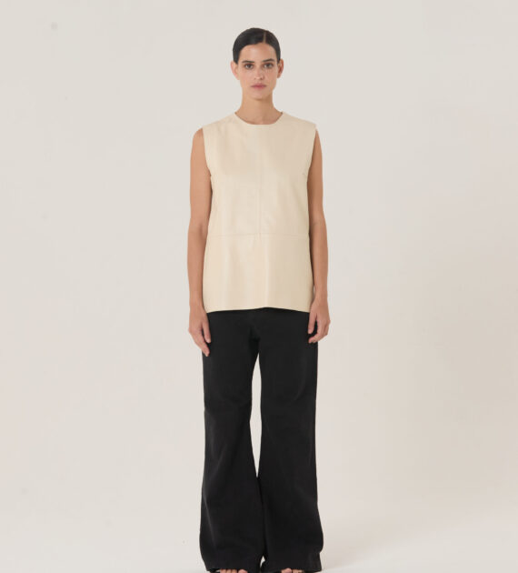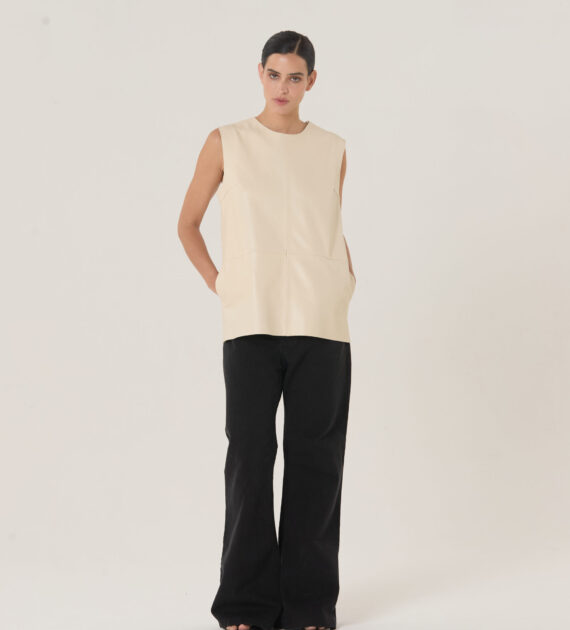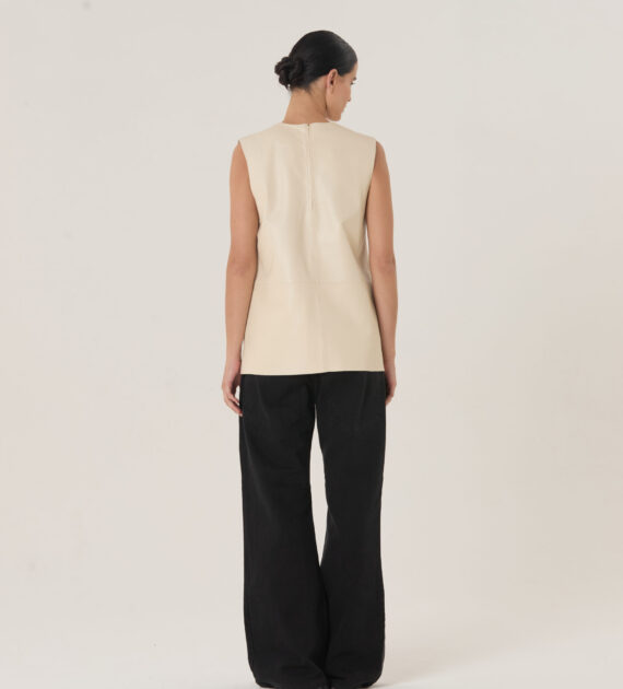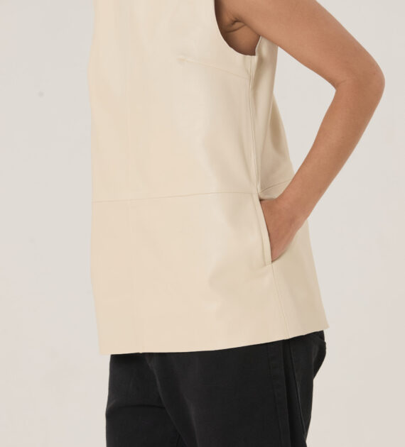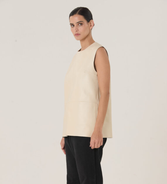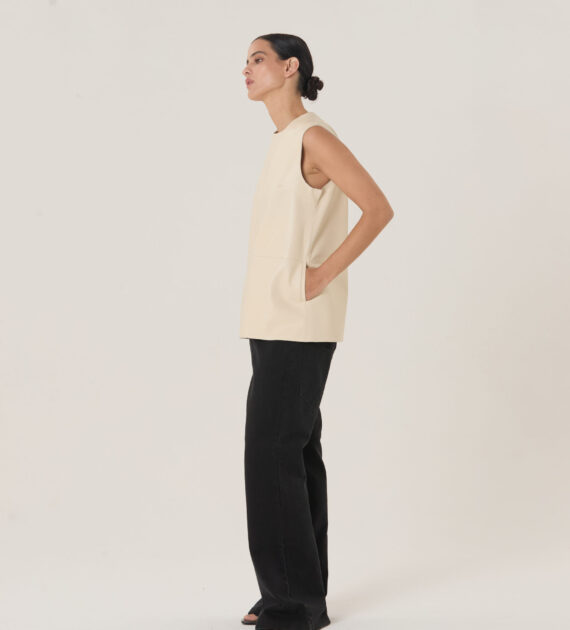 Remera sin mangas, de silueta boxy y largo intermedio, confeccionada en cuero de oveja soft.