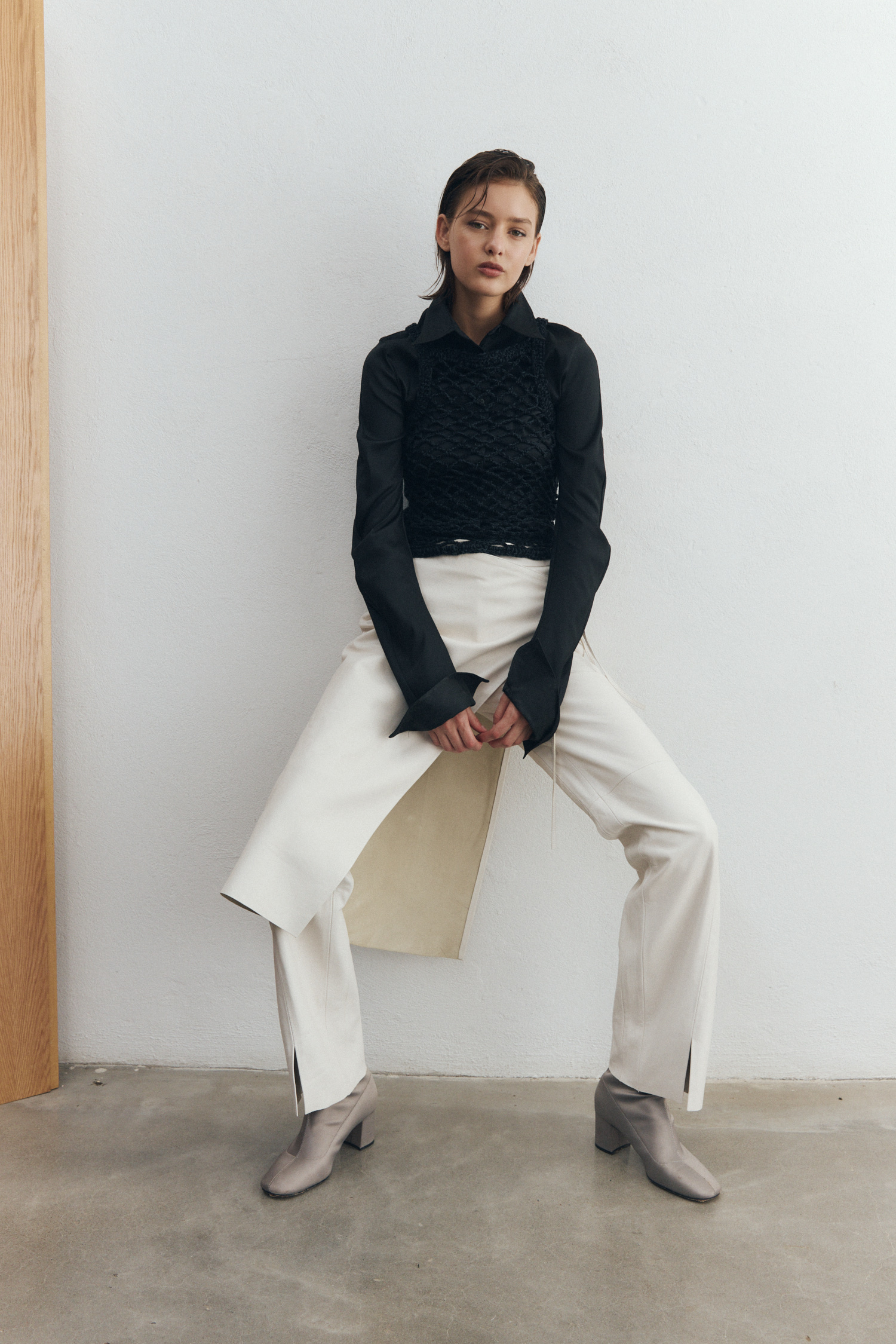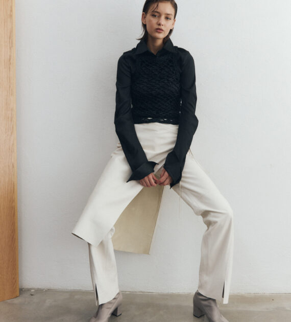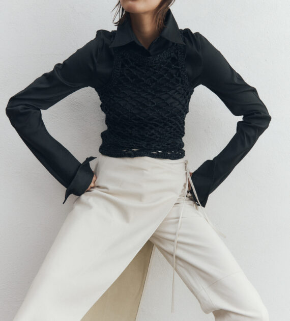Confeccionada en cuero de oveja soft sin forrar, esta prenda es ideal para jugar con diferentes capas sobre pantalones, vestidos y faldas, de un modo minimalista y contemporáneo.