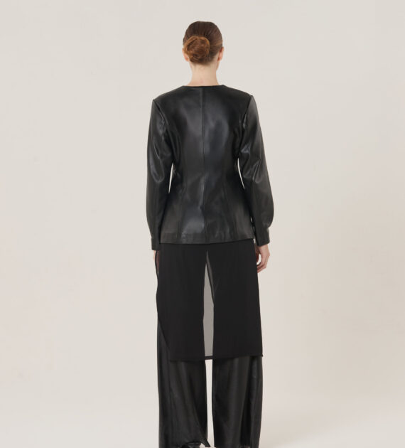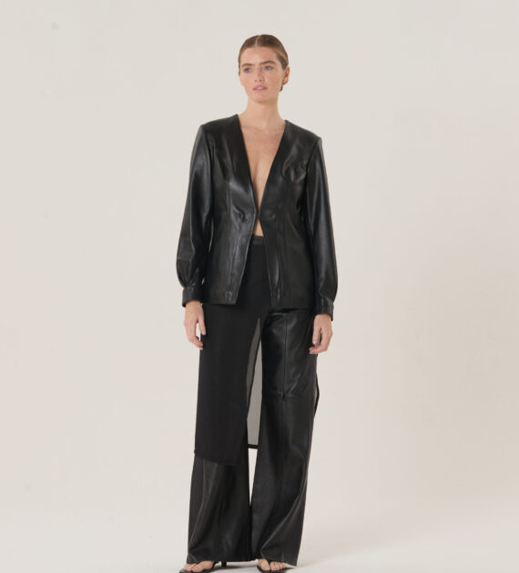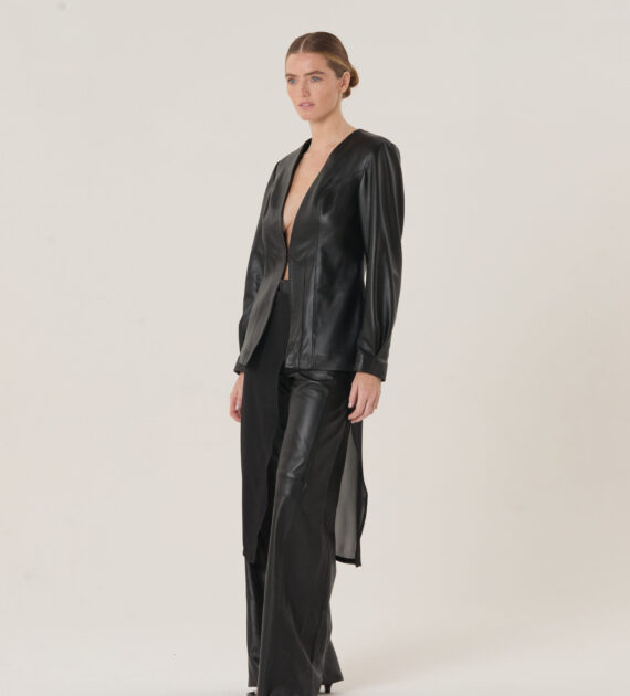 El blazer «Bali» está confeccionado en un cuero de oveja soft, con una silueta escultórica pero discreta, libre de bolsillos o costuras visibles,