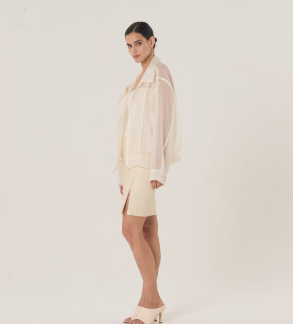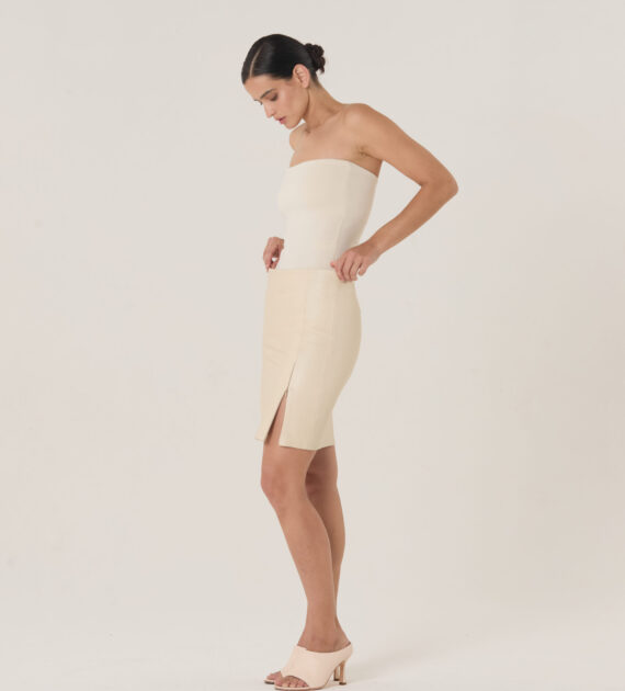 Pollera confeccionada en cuero soft de oveja, de calce levemente fit y tajos con cierres invisibles regulables.