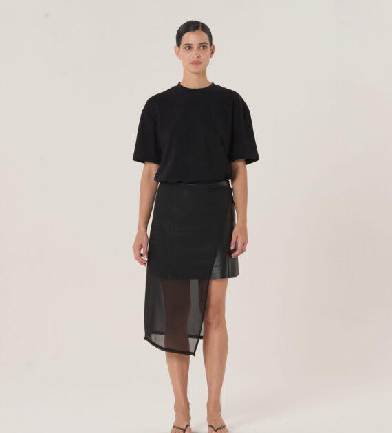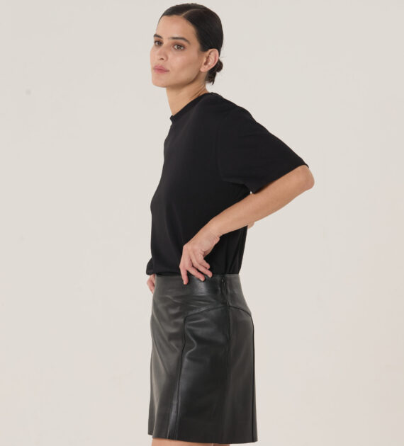 Pollera confeccionada en cuero de oveja soft, de silueta evasé, recortes corseteros y cierre invisible lateral.