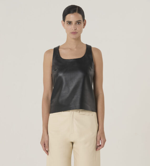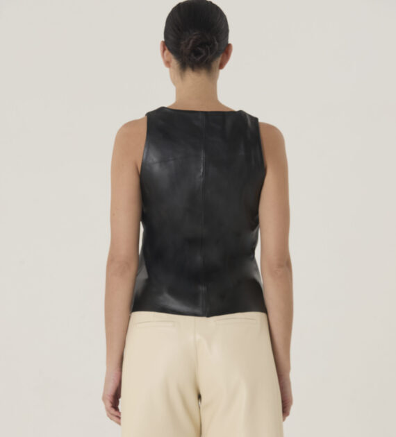 Musculosa de líneas limpias, escote redondo y ruedo recto, confeccionada en cuero de oveja soft.
