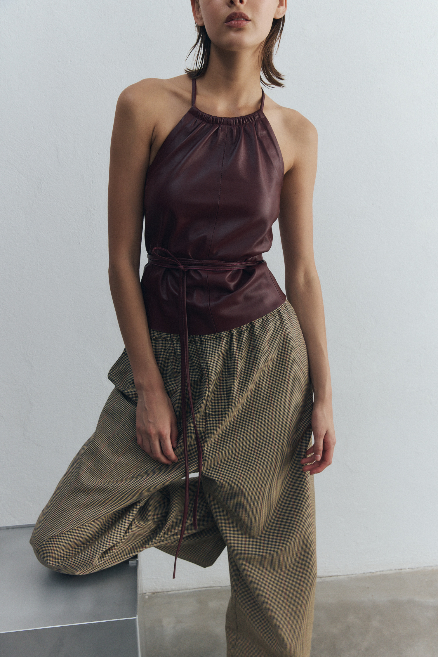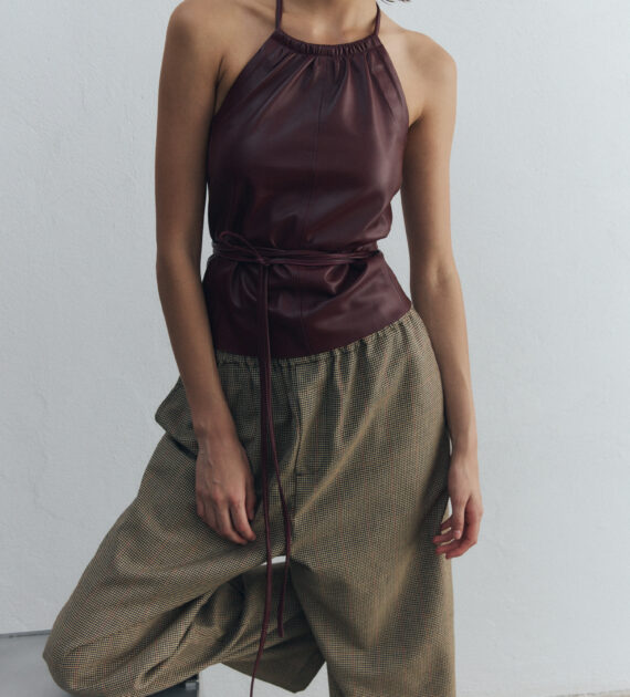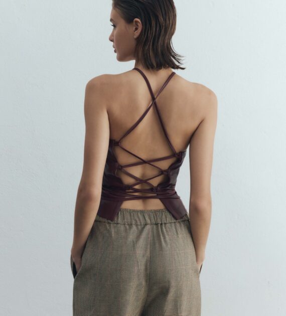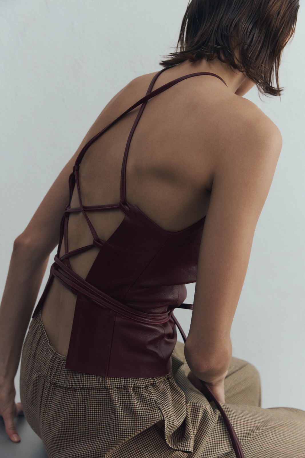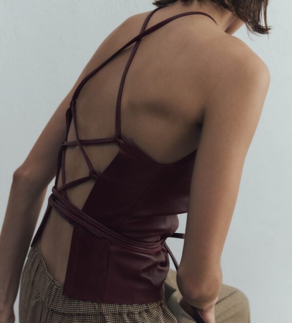 Confeccionado en cuero de oveja soft sin forrar, este top presenta múltiples usos ya que sus tirillas de cuero te permiten regular el entalle para que puedas usarlo solo, o sobre otras prendas.