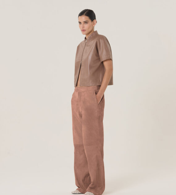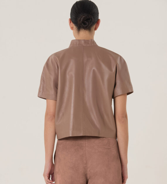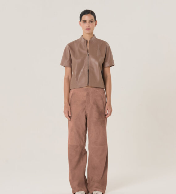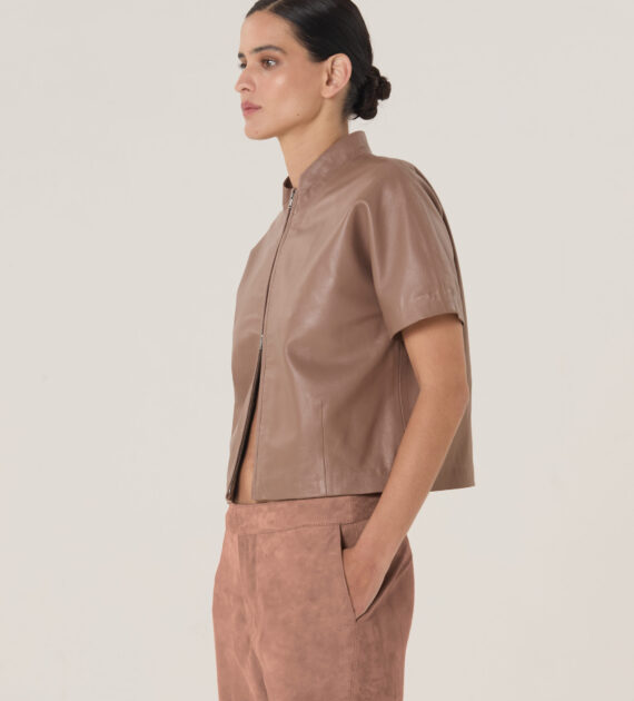 Remera crop con cierre doble camino central y cuello medio alto, confeccionada en cuero de oveja soft.