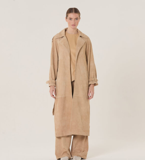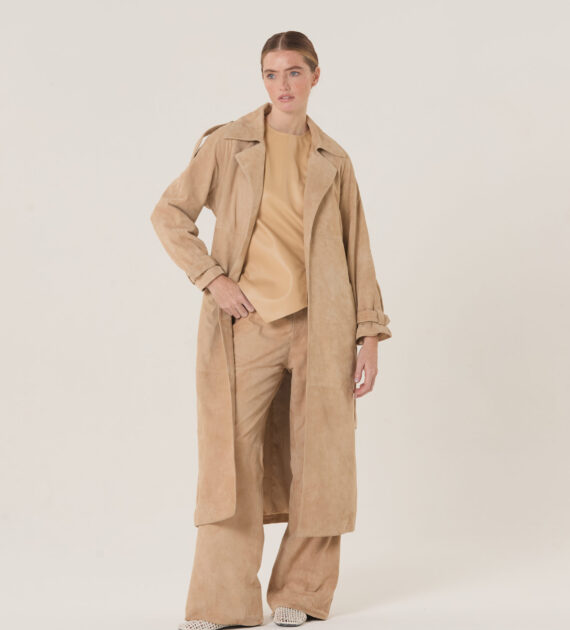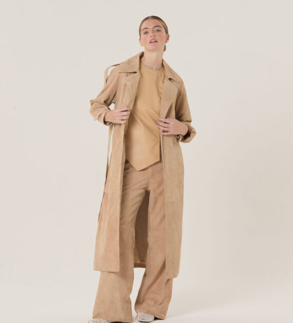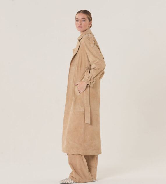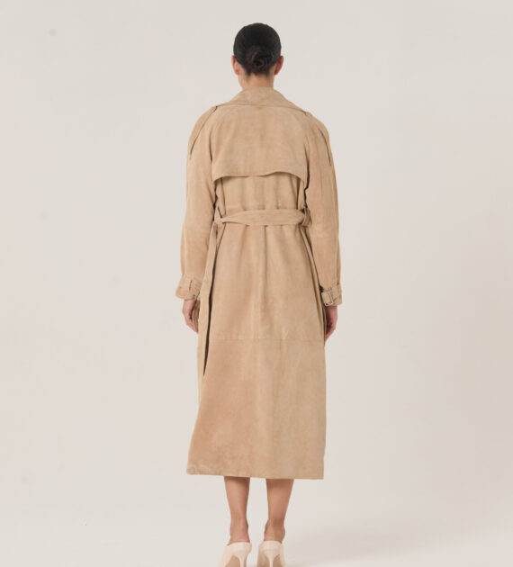 Trench de solapa sastrera, acceso cruzado y lazo, confeccionado en cabra gamuzada soft.