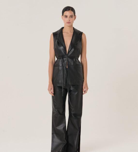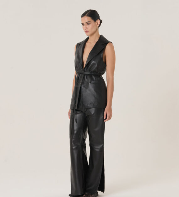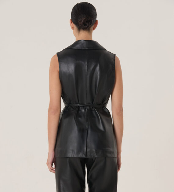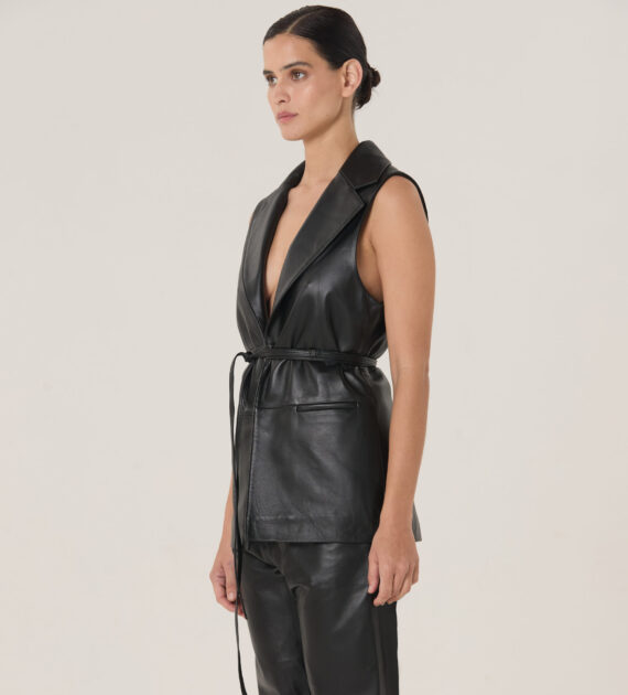Chaleco sastrero minimalista de largo intermedio, con lazo de múltiples ajustes, confeccionado en cuero de oveja soft.